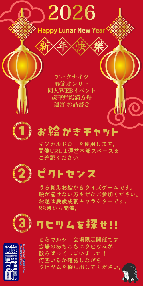 一方で、ページ上の広告が多く、不具合で参加できなかったというお声もありました。また、今回の歲華烂熳満方舟2026には海外からの参加者さまもいらっしゃいましたが、ピクトセンスは日本国外からの接続を遮断しているため、参加できなかったケースもありました。これらの点を踏まえ、次回は別の企画を検討いたします。