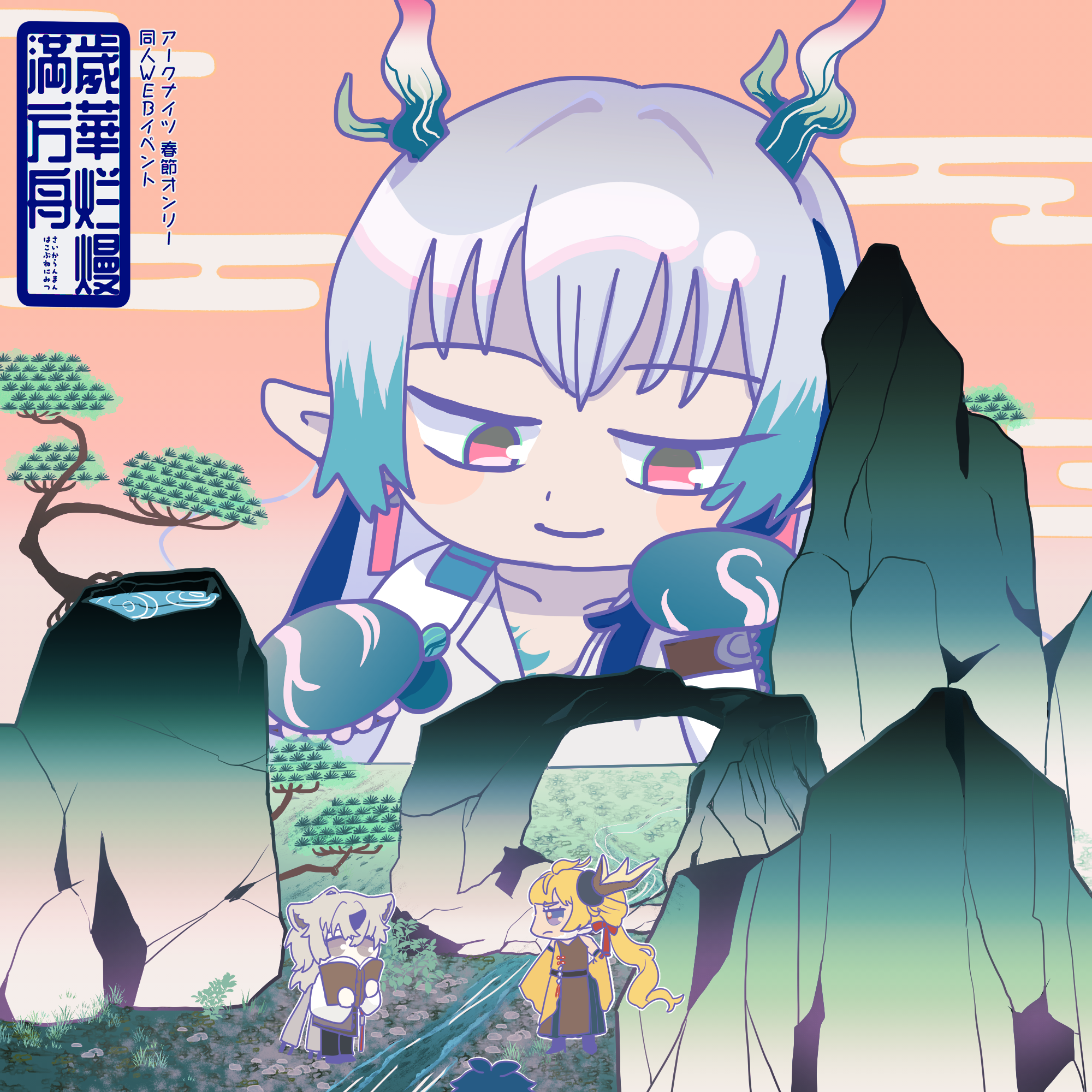 「歲華」は年月や春そのもの、めでたい光景、春に咲く花を示し、「烂熳」は「爛漫」の中国語表記です。「満方舟」は「方舟に満つ」と読みます。新春の美しい花々が爛漫に広がり、方舟(ロドス艦や、アークナイツを楽しんでいるコミュニティ全体)に満ちていく、という意味を込めています。
